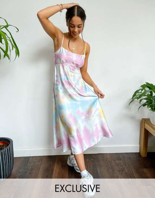 Collusion Tie Dye Open Back Satin Midi Slip Dress In Multi Asos