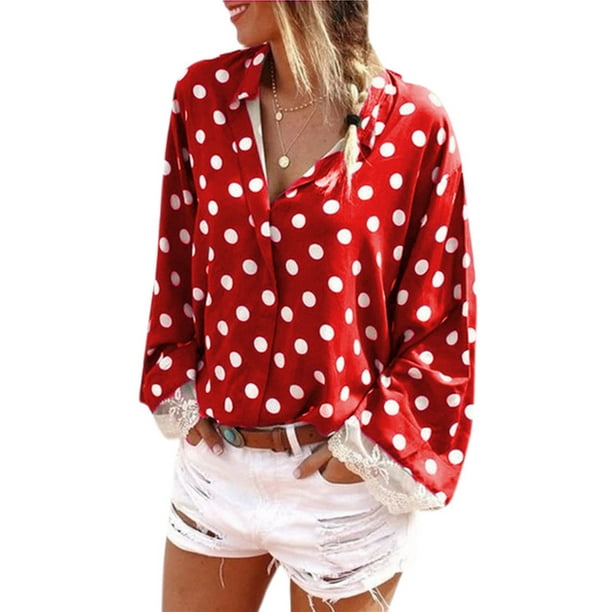 Moobom Women Shirt Red Polka Dot Shirt Women Blouse Lace Polka Dot Shirt Casual T Shirt Loose Tunics Long Sleeve Sweatshirt Fashion Baggy Tops Walmart Com Walmart Com